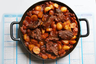 - Tailler le bœuf en cubes de 3 à 4 cm de côte. Peler les oignons sans les écorcher. Peler et couper les carottes en rondelles pas trop fines (2mm au minimum). Peler l'ail et enlever le germe.